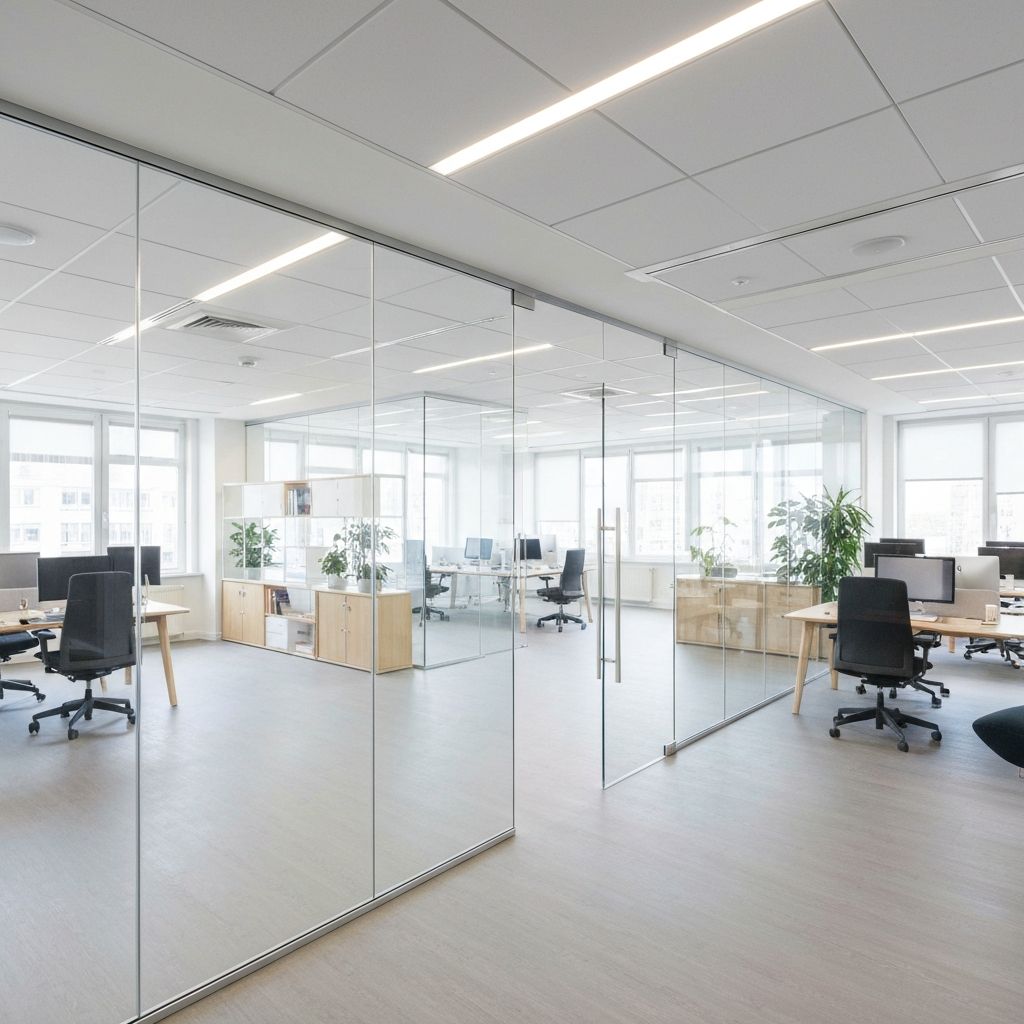Modern office partitions and room dividers with sleek glass aesthetics.